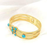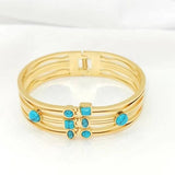 The Zumo Bracelet is a statement of elegance and individuality. Crafted from 316 stainless steel, it features radiant turquoise stones that add a fresh, vibrant touch to your look. The golden finish and geometric stone arrangement make it both modern and timeless — perfect for day or night wear.