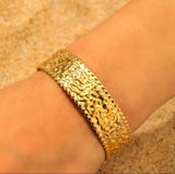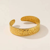 A bold open cuff bracelet crafted from premium 316 stainless steel with radiant gold plating. Featuring an intricate textured design with a dotted border, it exudes artistic elegance and timeless charm. Perfect for elevating everyday looks or adding a statement touch to special occasions.