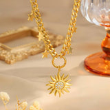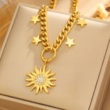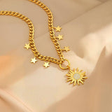 A radiant choker crafted from premium 316 stainless steel with luxurious gold plating. Featuring a bold sun pendant adorned with sparkling crystals, surrounded by dangling golden stars that capture celestial charm. Elegant, durable, and perfect for adding a touch of cosmic glow to your everyday or evening style.